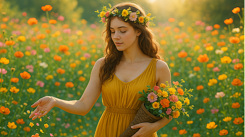 D'une corne d'abondance magique, elle semait avec grâce les fleurs sauvages les plus simples et cultivait avec amour les plus rares et précieuses des roses, insufflant à chaque pousse une parcelle unique de sa grâce divine. Les Romains, touchés par sa générosité florale, lui rendaient hommage chaque année lors des Florales, des fêtes joyeuses et exaltantes où le vin coulait à flots et où les danseurs, en liesse, célébraient la fertilité et la générosité de la terre nourricière.